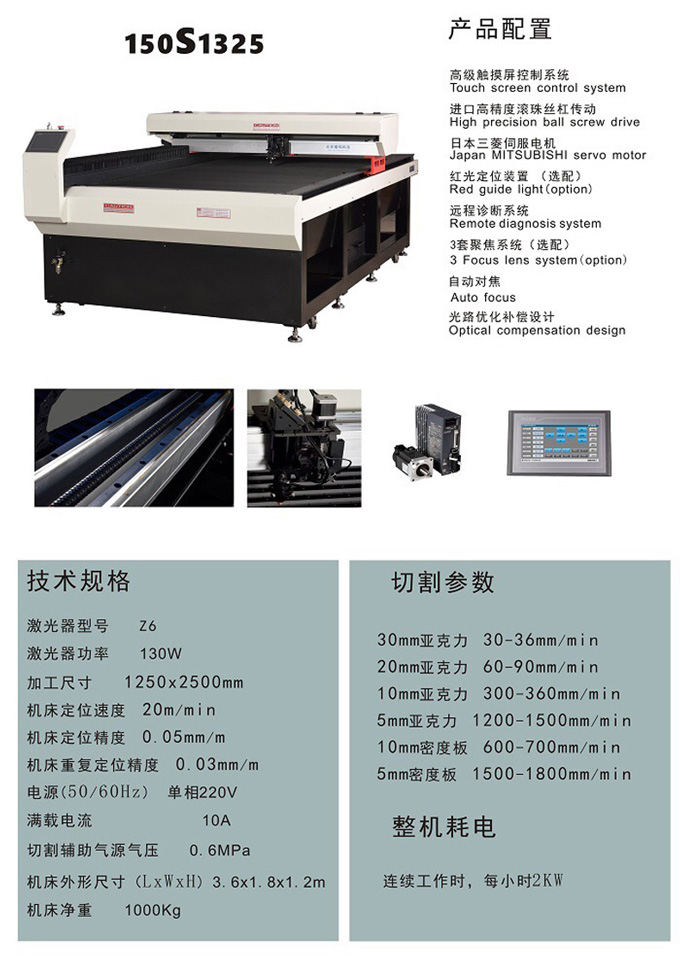 1325丝杆激光切割机主要用于亚克力、竹木制品、中线板、密度板等1公分以上的非金属材料高速及高精度切割;