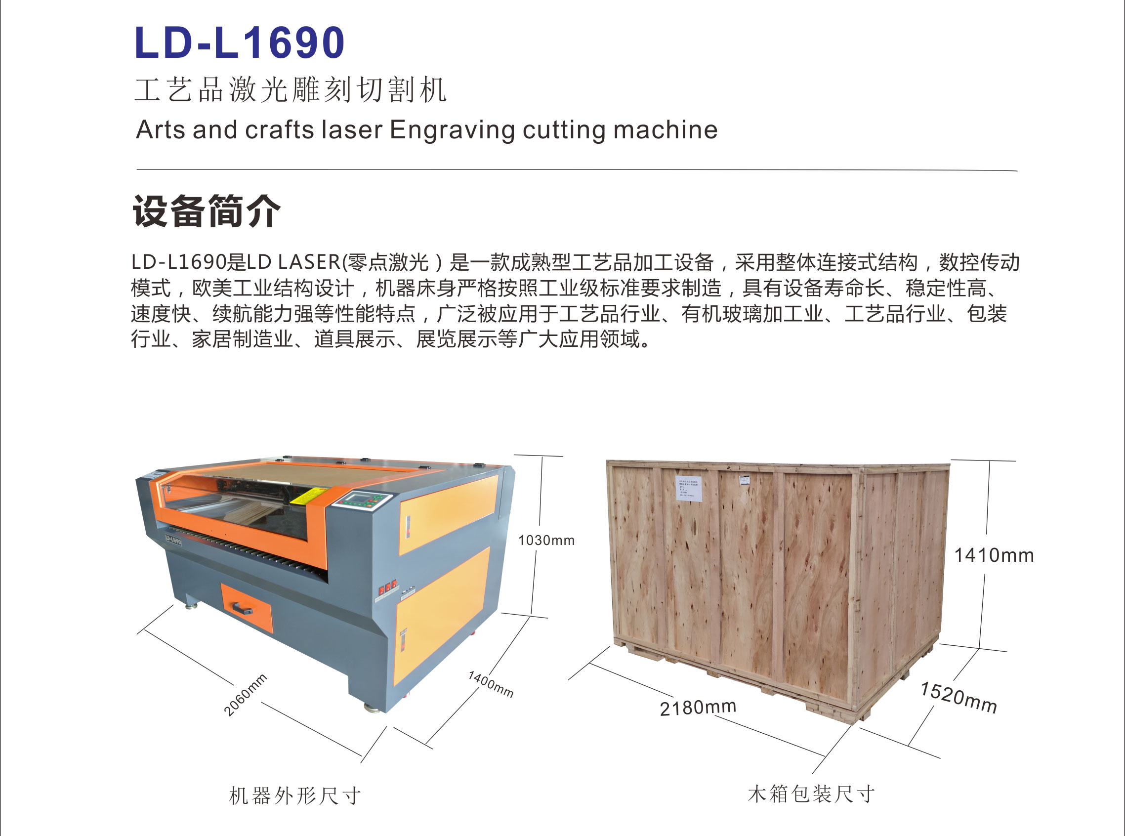 LD-L1690是LD Laser(零点激光)一款成熟型工艺品加工设备,采用整体连接式结构,数控传动模式,欧美工业结构设计,机器床身严格按照工业级标准要求制造,具有设备寿命长、稳定性高、速度快、续航能力强等性能特点,被广泛应用于工艺品行业、有机玻璃制造业、包装行业、家具制造业、道具展示、展览展示、服装制造业等广大应用领域。